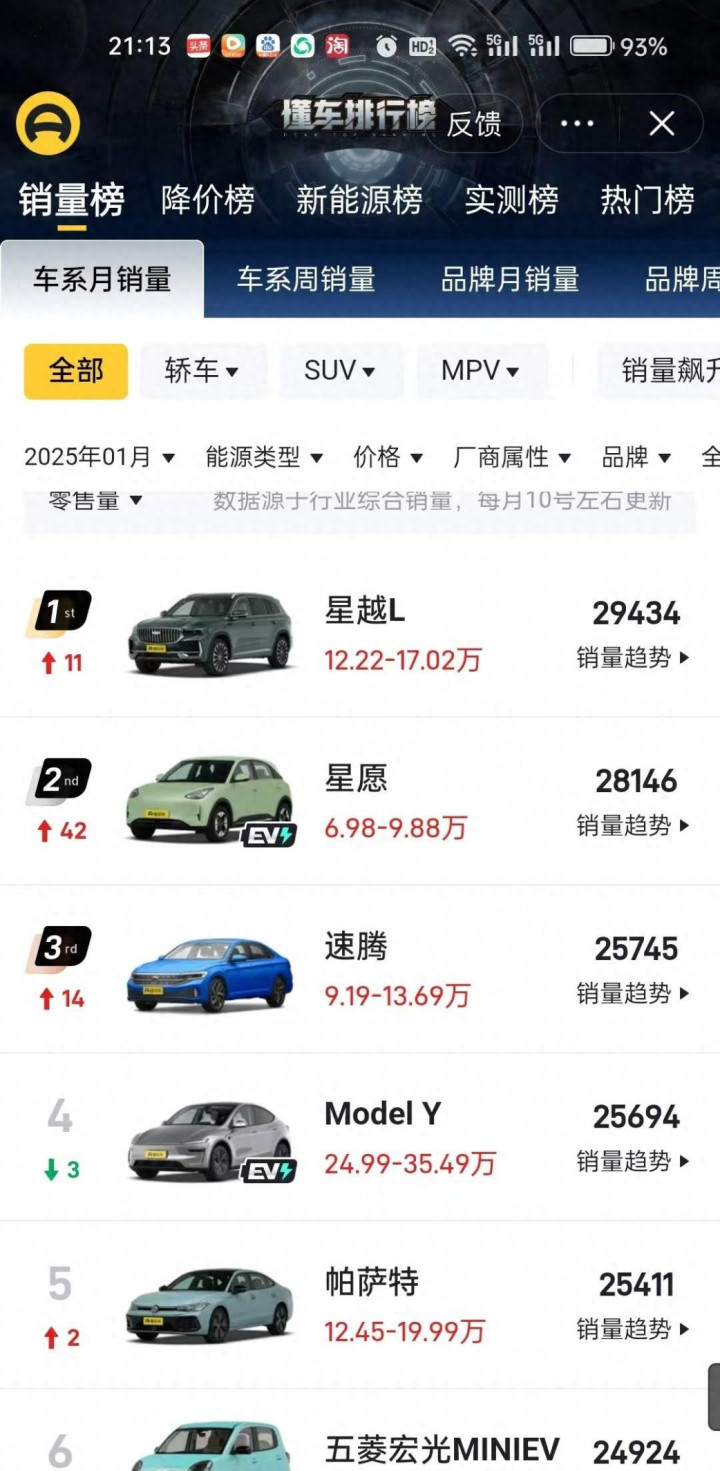 2025年刚开年,中国车市就扔下了一枚重磅炸弹:吉利,竟然把比亚迪拉下马了!一向在销量榜上稳坐钓鱼台的比亚迪,在一月份竟然被吉利反超,这简直是车圈里的“大新闻”。吉利旗下多款车型销量暴涨,尤其是星越L,直接拿下单月销冠,把特斯拉、比亚迪这些老牌冠军都甩在了身后。这究竟是吉利的一时爆发,还是中国汽车市场格局即将发生巨变的信号?